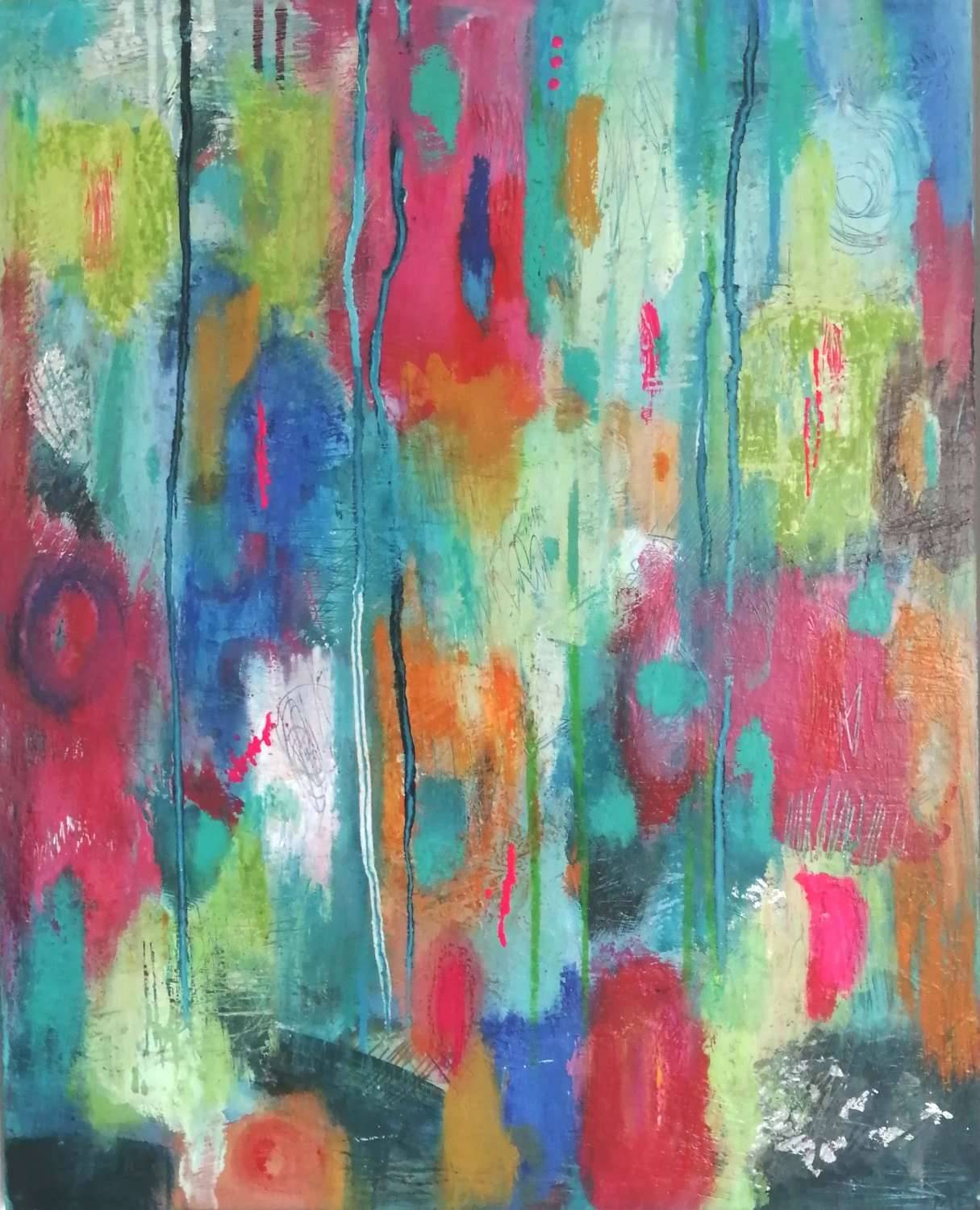 This is the first of a series of three paintings evoking Cornish rockpools shimmering in the summer heat. The name ‘Oscillation’ reflects the constant ebb and flow of the sea through time: the twice-daily filling and emptying of the rocky pools, in a clockwork play of light and sound upon the unmoving backdrop of ancient rocky strata. This painting evolved over many weeks. I chose an essentially summer palette, and added layer upon layer, blending together the edges of semi-wet areas of paint, followed by scraping and scratching as the paint started to dry. I then carefully sanded off some parts to explore what lay beneath. As this process was repeated, I added glazes for depth, and also a little gold leaf with a silver finish. Approaching completion, I allowed acrylic inks to drip down the painting, reminiscent of running water in the hazy heat of summer.