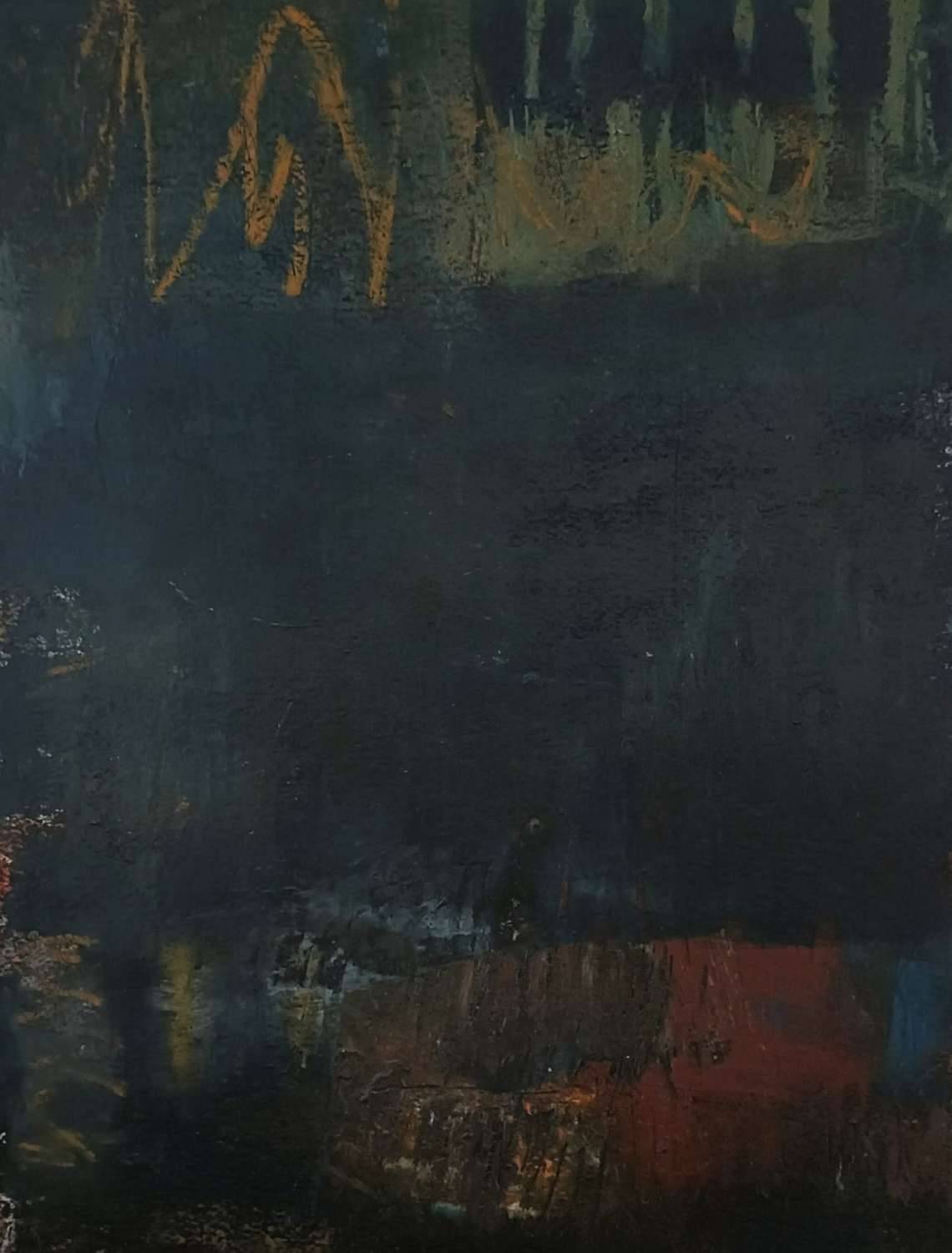This painting seeks to capture the ancient textures and colours of the rocks of West Penwith, inspired by their geological history and the tectonic forces that were key in their evolution. Combining dark areas in hues of very dark grey, blue and green, with areas of orange, ochre and burnt umber colours, alongside lighter blues, it evokes the history of tectonic forces that shaped Cornwall's geology, its more recent mining legacy and the sea. Rich in texture, the work was painted in oil and pigments, with cold wax and rock powders adding body to the paint mix. Mark-making included scratching, scraping and gouging, resulting in an aged patina.