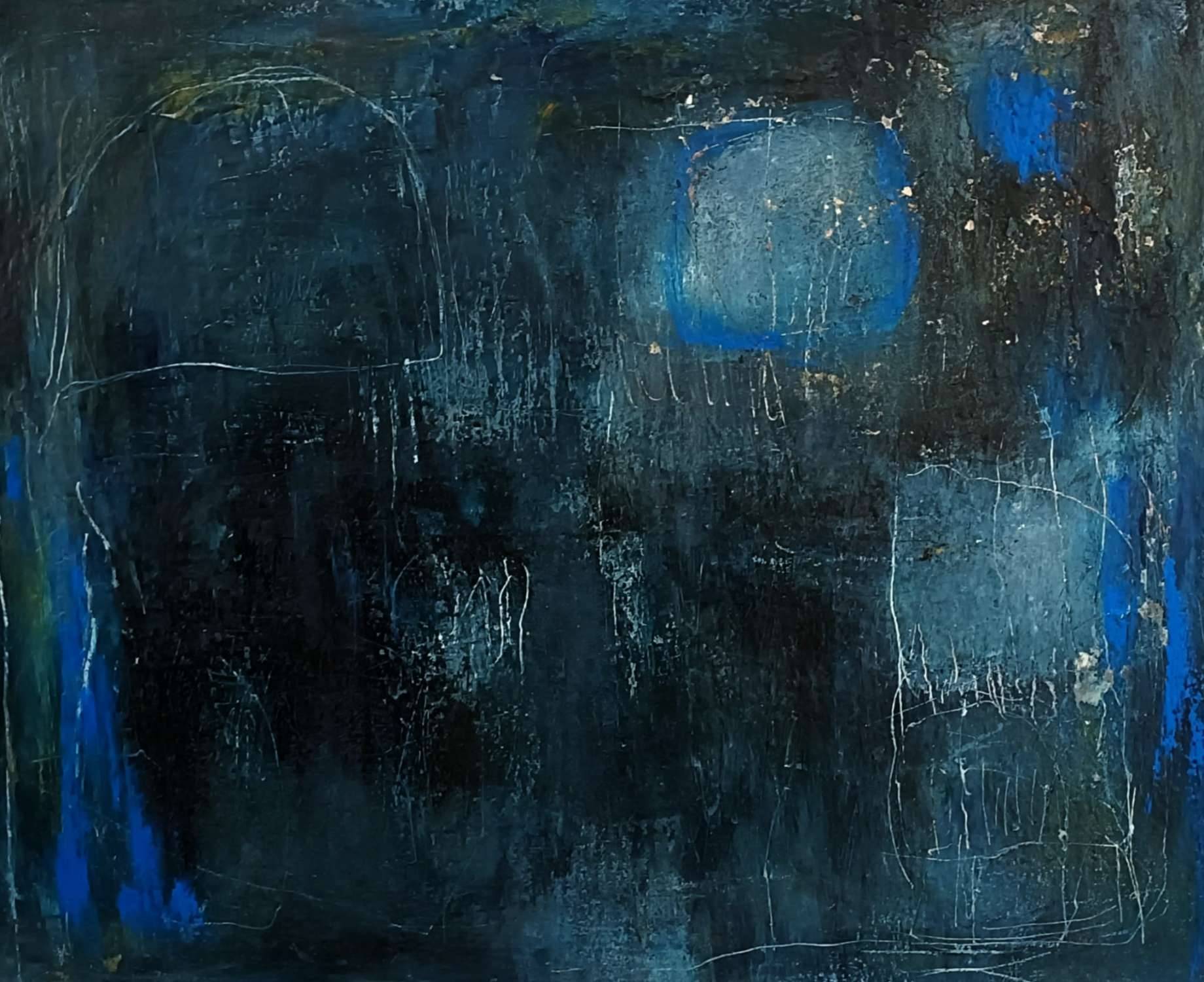 A painting developed over many layers of oil paint, cold wax, pigments and rock powders with a heavily textured surface, scratched and scored, and depths of many shades of dark; it forms a diptych with ‘Edge’, that would work as a pair on the same wall or separated.