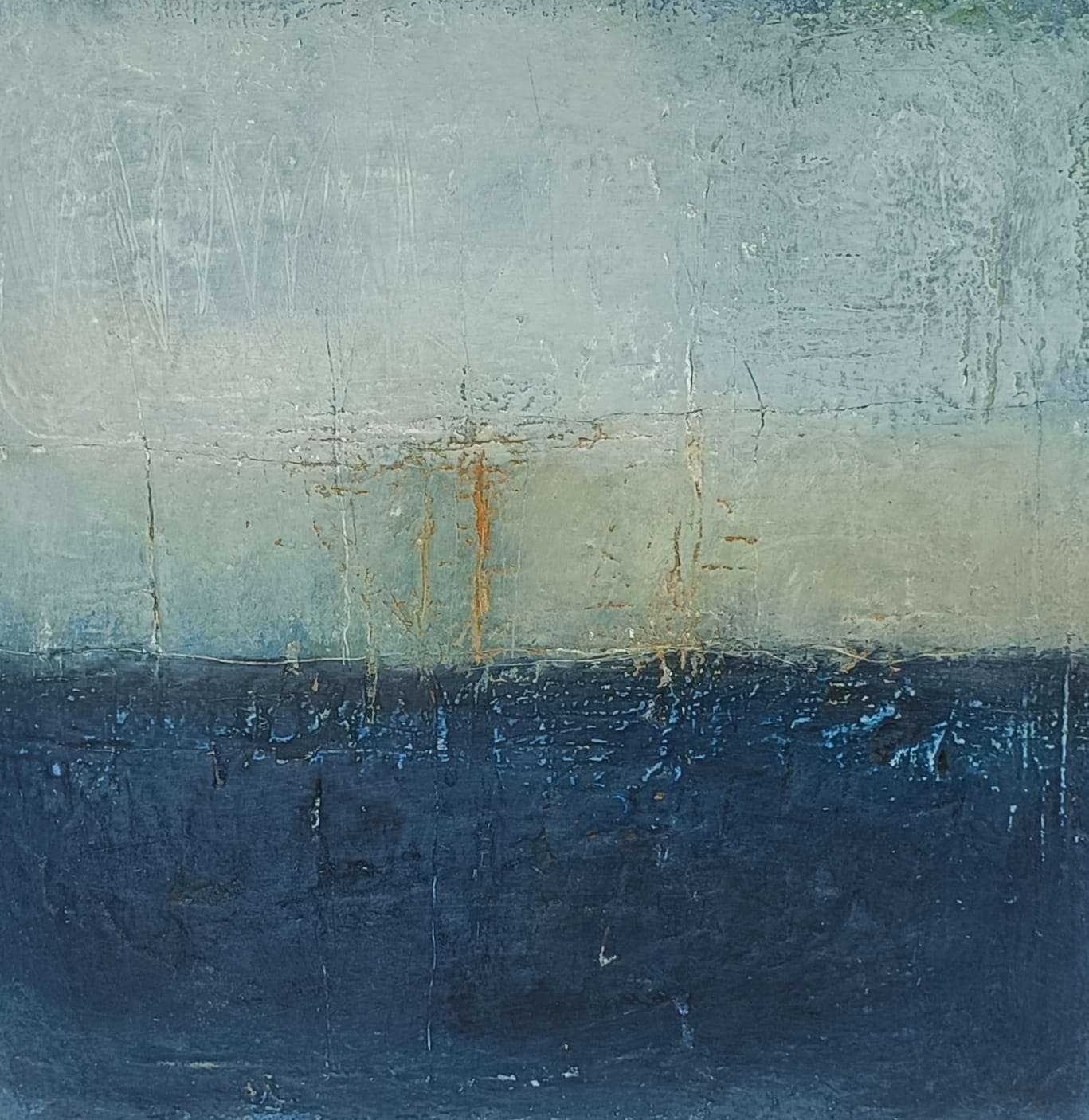 A textured painting built up over many layers, inspired by the age of our coast: the ancient beautiful rocks of Gwithian between the sky and the dark sea.