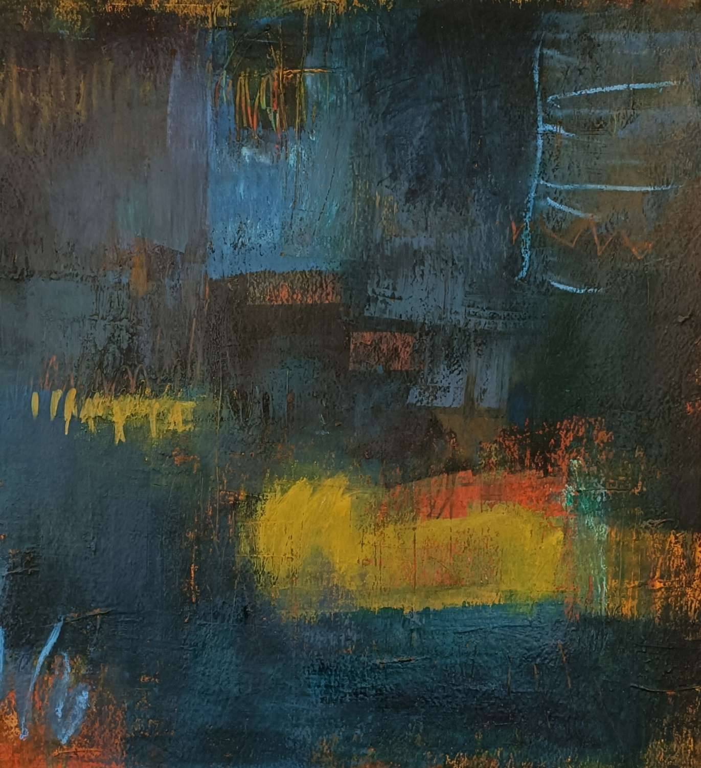 This work was inspired by the coast path of the West Penwith area west of St Ives, the dark sea, and the glorious colours of the coast. It also reflects the colours and textures of some of the ancient rocks along this stretch of coast. I wanted the work to have a raw energy about it. Rich in texture, the work was painted in oil and pigments over an acrylic base layer, with cold wax and rock powders adding body to the paint mix. Expressive mark-making results in an aged patina.
