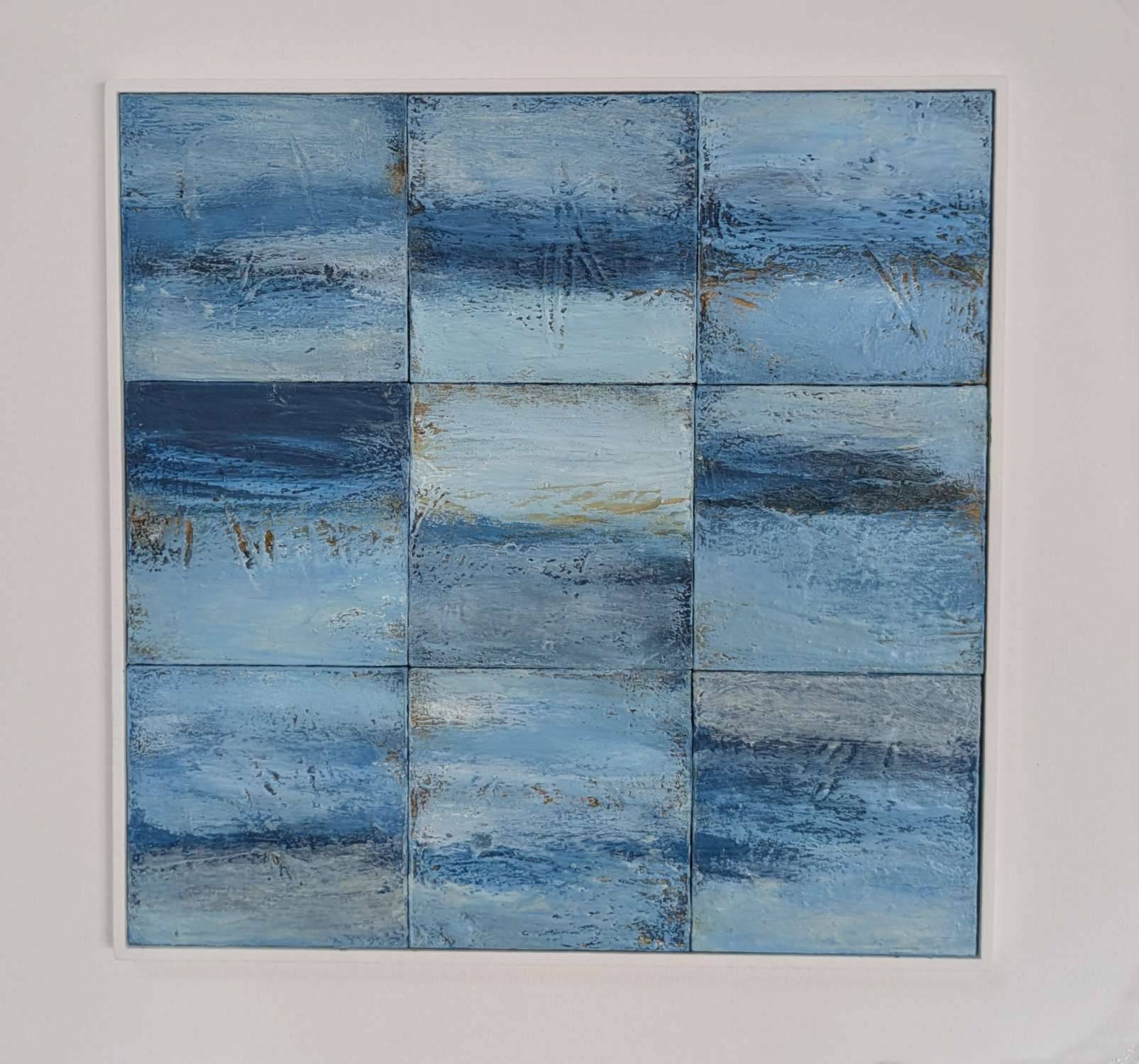 This work was created by placing nine small abstract seascapes together to make one piece of art. The works were inspired by walks along the coast path in West Penwith, Cornwall.