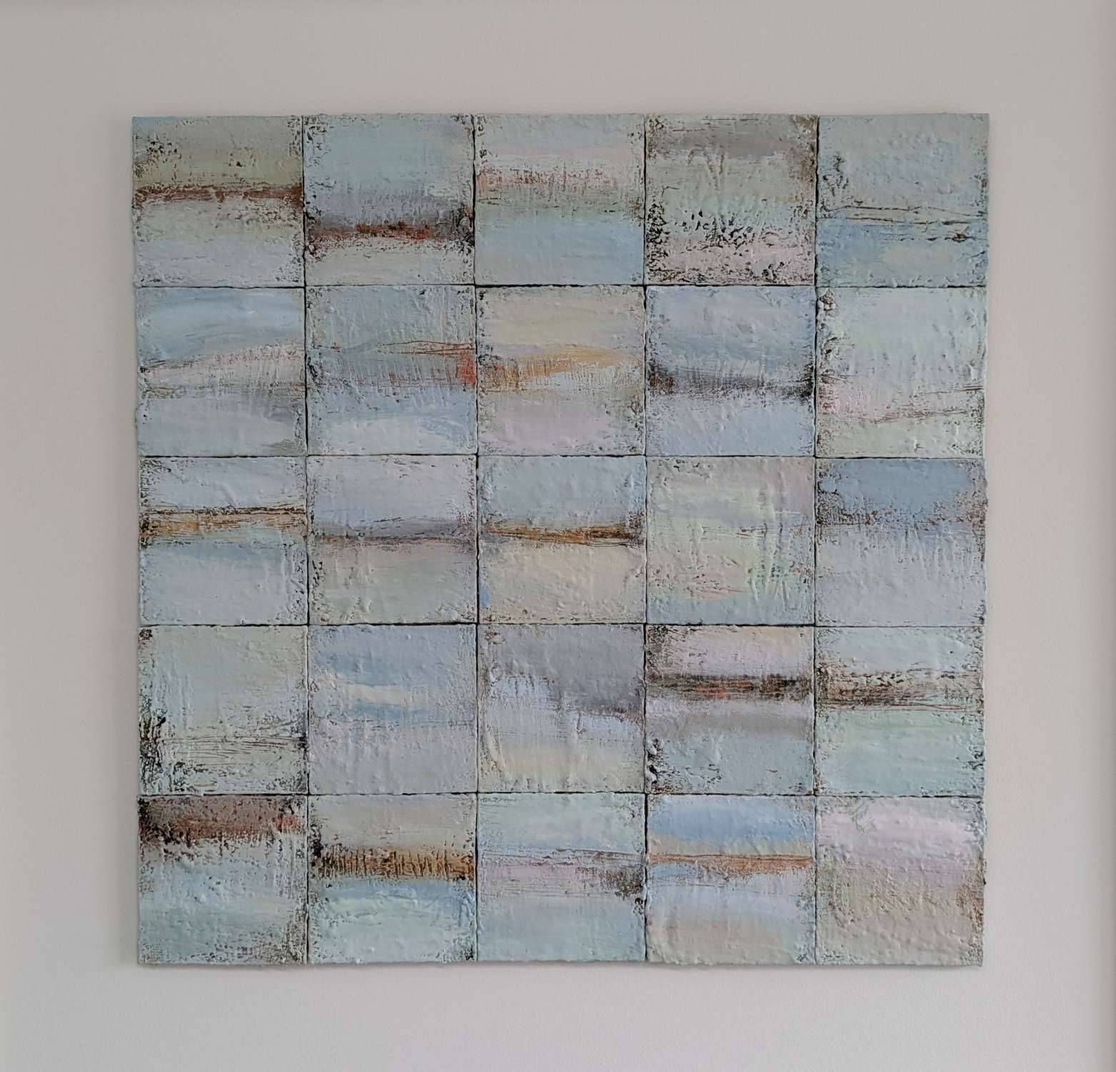 This work was created by placing 25 small abstract landscapes and seascapes together to make a composite piece of art. The works were inspired by quiet walks on the coast path in West Penwith.