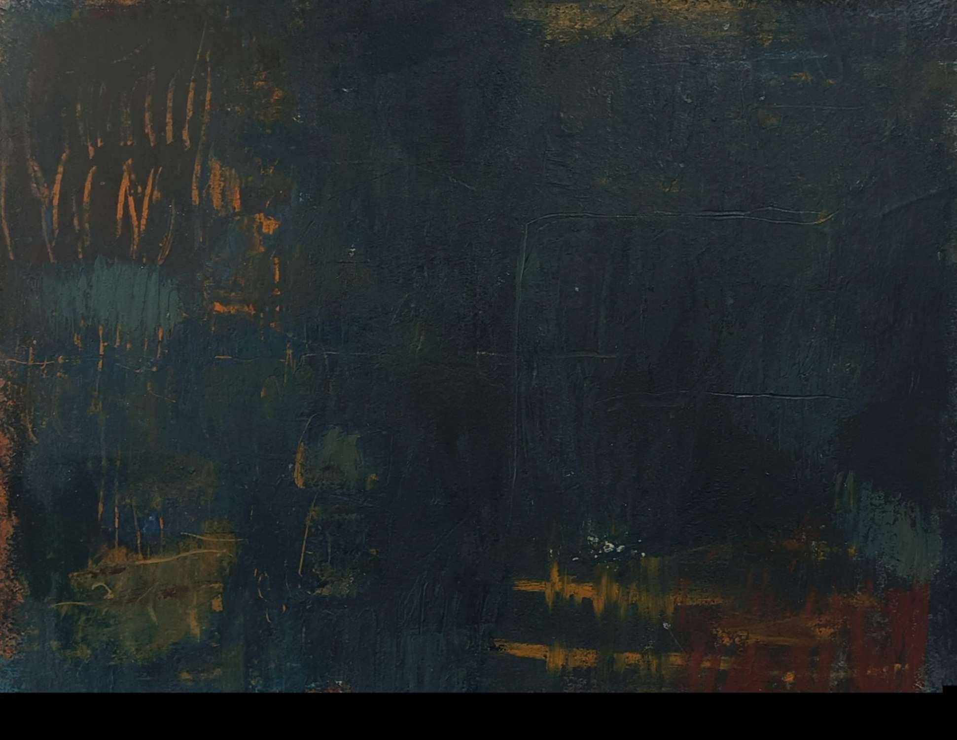 grey, blue and green, with marks in orange, ochre and burnt umber colours, to