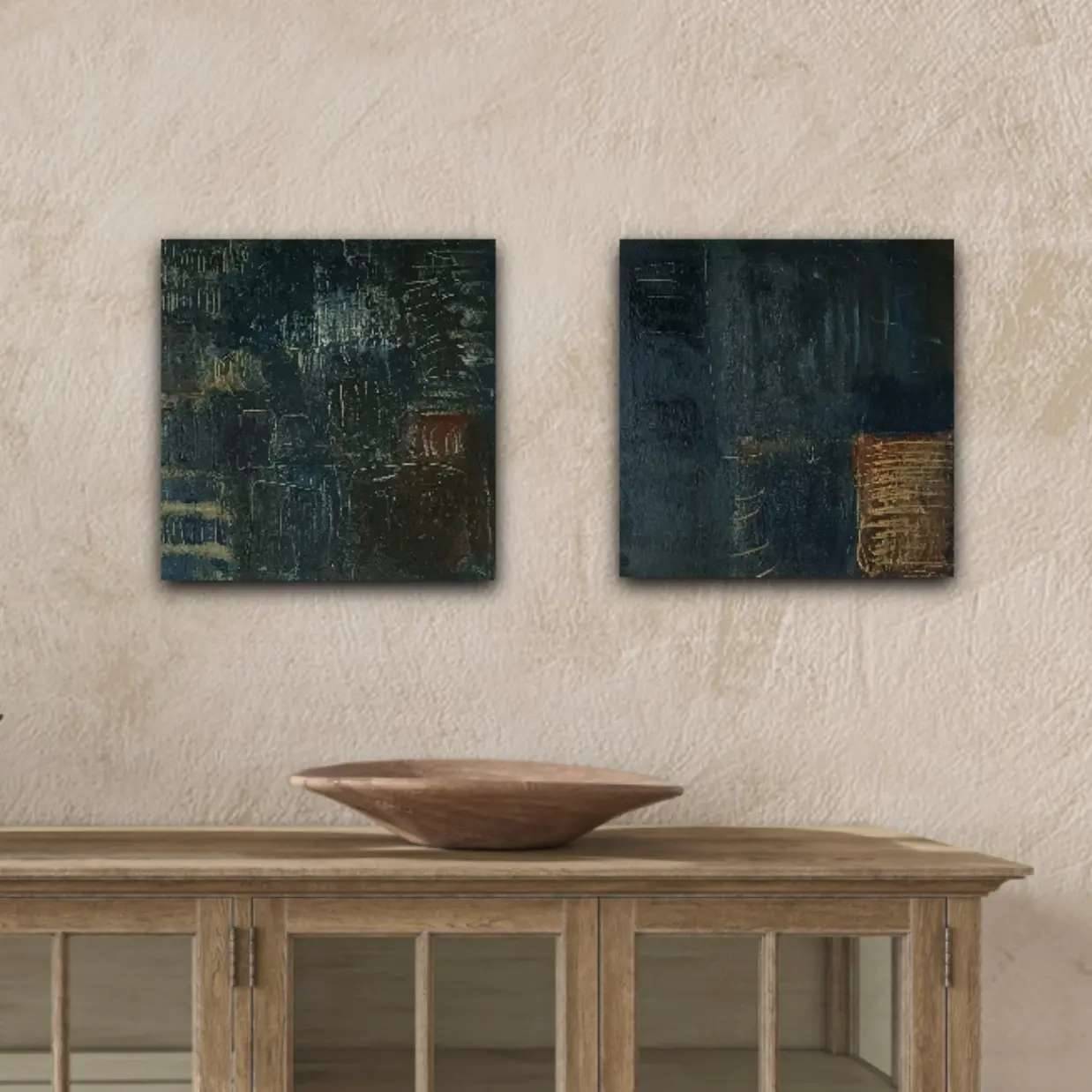 This painting seeks to capture the ancient textures and colours of the landscape of West Penwith, inspired by their geological history of plate tectonics and the massive Cornish granite instrusions (the ‘Cornubian batholith’). Combining areas of very dark grey, brown, blue and green hues, with lighter ochres and burnt umber colours, it evokes the rocks and sea, as well as the more recent mining legacy. Rich in texture, the work was painted in oil and pigments, with cold wax and rock powders adding body to the paint mix. Mark-making included scratching, scraping and gouging, resulting in an aged patina.