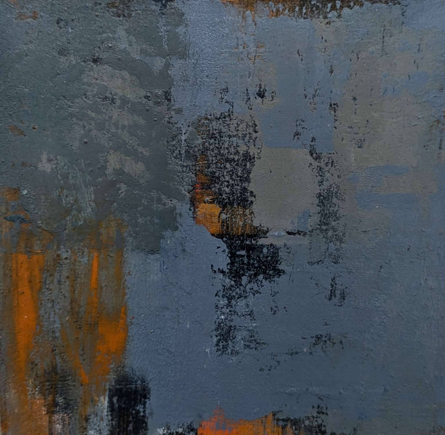 One of a series of small works in greys and blues with burnt orange colours, inspired by the patterns I see in the rocks and the iron oxide staining on the Gwithian stretch of coast near Godrevy lighthouse. Painted in oil and pigment with cold wax and rock powders, on panel.