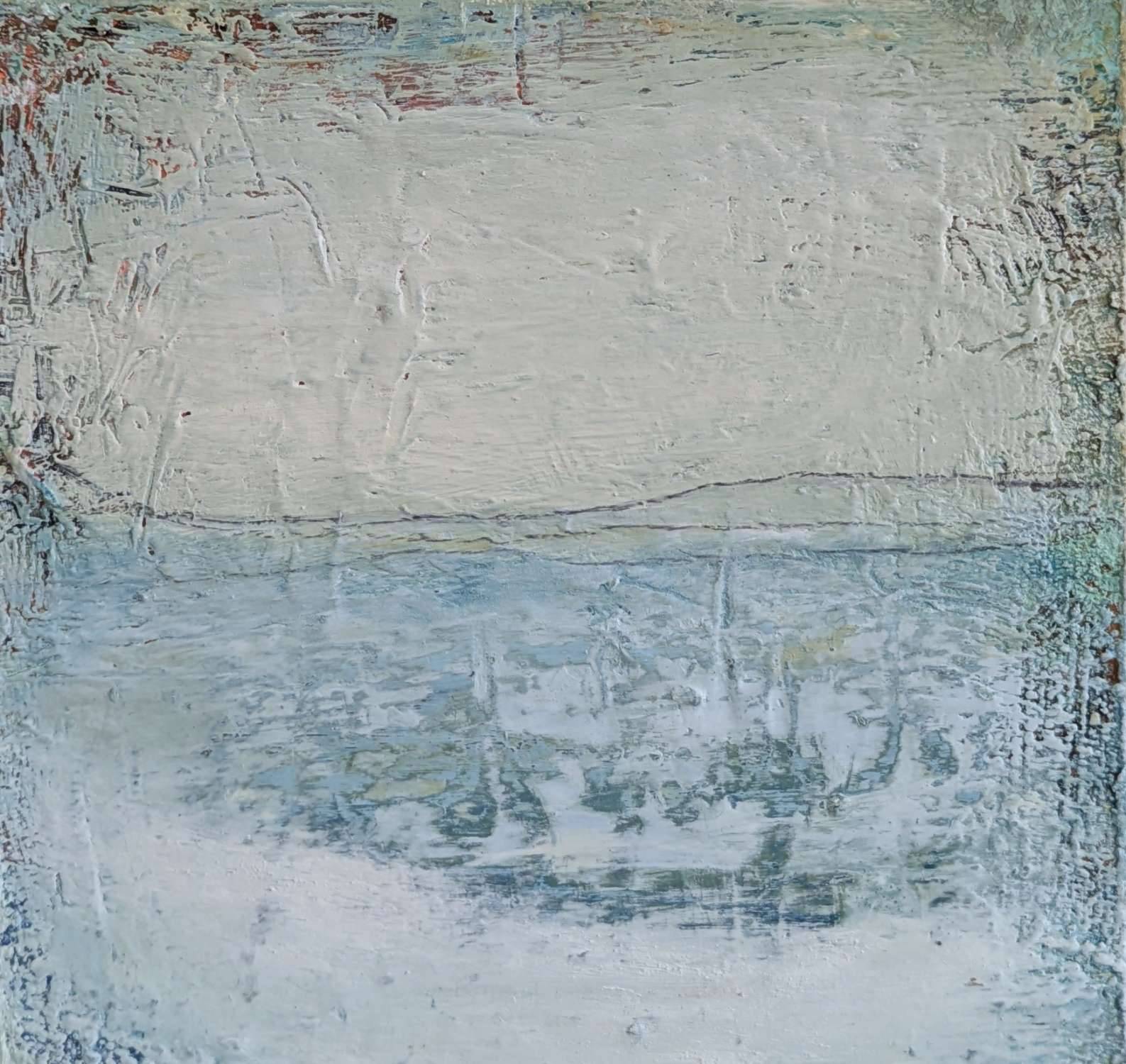 A small abstract painting in a series inspired by walks along the coast path at Gwithian, near Godrevy Lighthouse.  Ancient rocks, folded and fractured and a long sandy beach. A wonderful walk, whatever the weather.