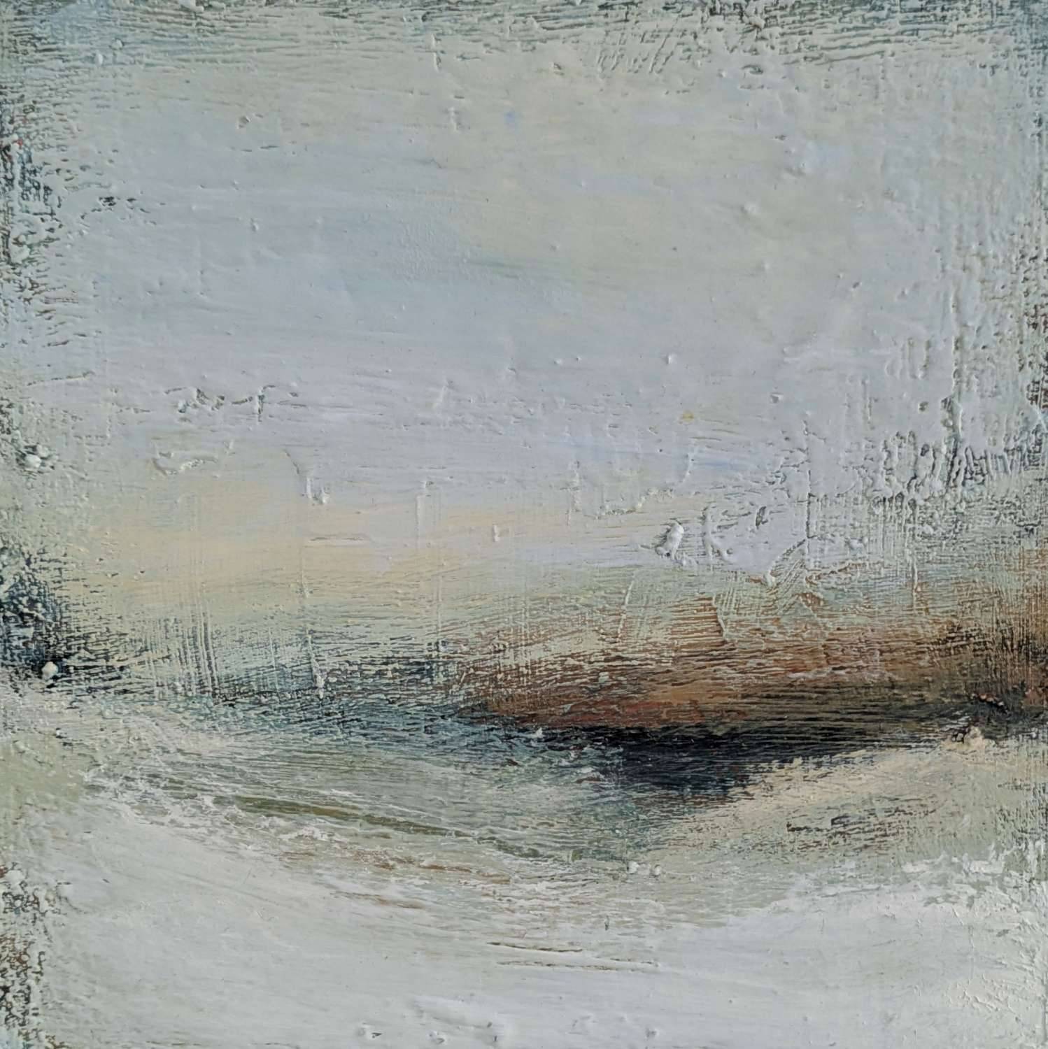 A small abstract painting in a series inspired by the coast path from St Ives to Zennor - the path wends its up-and-down way through ancient basalt and granite rocks, waves crashing below the cliffs, moorland on the landward side.
